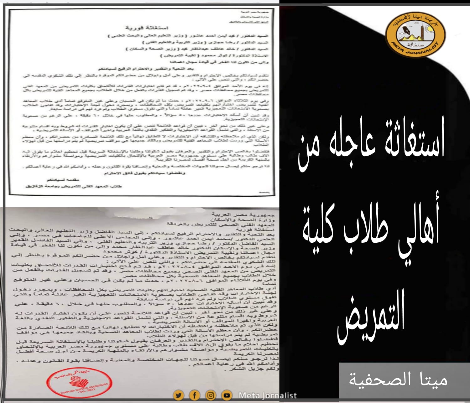 فتفضلوا بخالص الإحترام والتقدير والعرفان بقبول شكوتنا وطلبنا بالإستغاثة السريعة قبل تحطيم احلام ما يفوق ال٨ الآف طالب وطالبة علي مستوي جمهورية مصر العربية بالإلتحاق بالكليات التمريضية ومواصلة مشوارهم والأرتقاء بالمنهة الكريمة من أجل صحة أفضل لمصرنا الكريمة