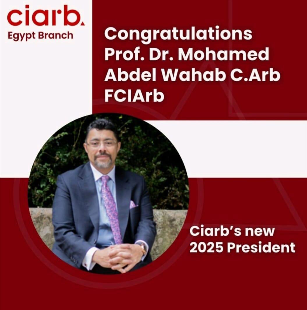 رئيس جامعة القاهرة يهنيء الاستاذ الدكتور محمد صلاح عبد الوهاب باختياره كأول مصري وأفريقي رئيسا للمجمع الملكي البريطاني للمحكمين (CIArb)