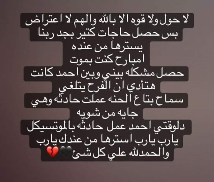 وأنهت قائله: “دلوقتي احمد عمل حادثه بالموتوسيكل يا رب يا رب استرها من عندك يا رب والحمد لله على كل شيء”.